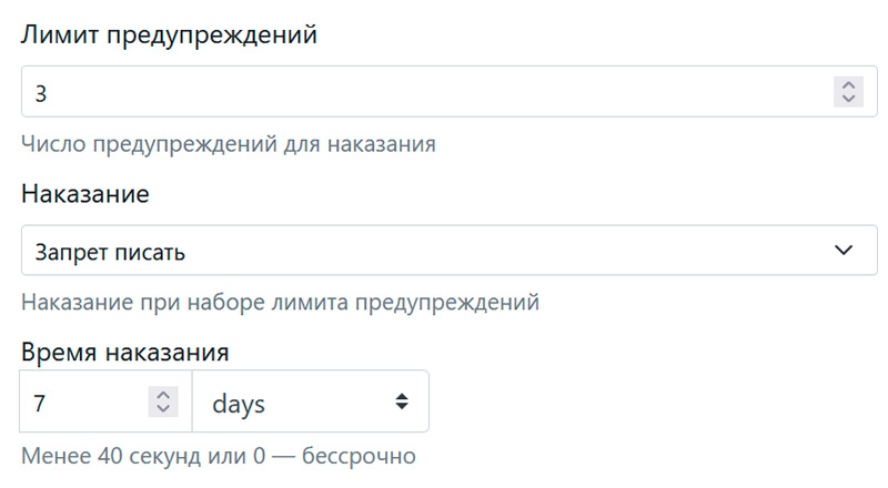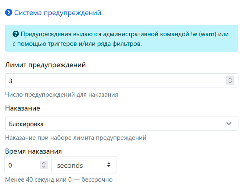 Теперь нажимаем на ссылку "Система предупреждений", чтобы ее раскрыть. Там можно задать лимит предупреждений и наказание при достижении лимита. Наказанием может быть полная блокировка (пользователь не будет видеть то, что пишется в чате, или же запрет писать). Также наказание может быть временным - на какой-то временной период: там задаются секунды, минуты, часы или дни. Имеет смысл задать наказанием (например, mute) при достижении какого-то лимита предупреждений.