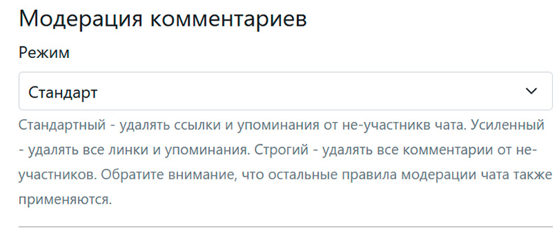 Далее настройка "Модерация комментариев" - это автоматическая модерация. Имеет смысл поставить режим "Стандарт". Там также есть режимы "Усиленный" и "Строгий".