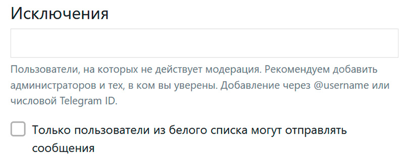 Еще тут можно задать пользователей, на которых не будет действовать автоматическая модерация, а для особо тяжелых случаев можно включать режим включения возможности комментирования только для пользователей из белого списка.