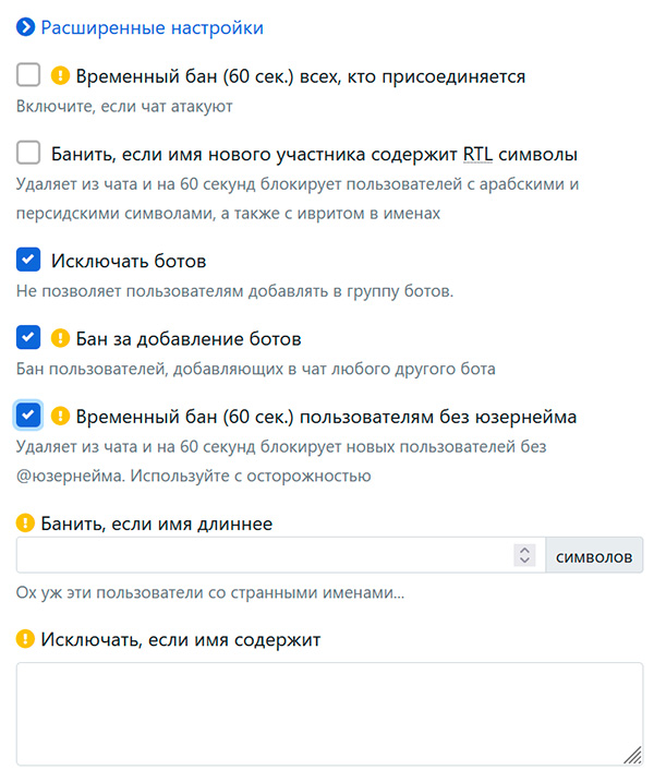 Там зайдем в "Расширенные настройки". Настройки на случай атак, также желательно сделать настройку исключения ботов и выдавать бан за добавление в чат других ботов.