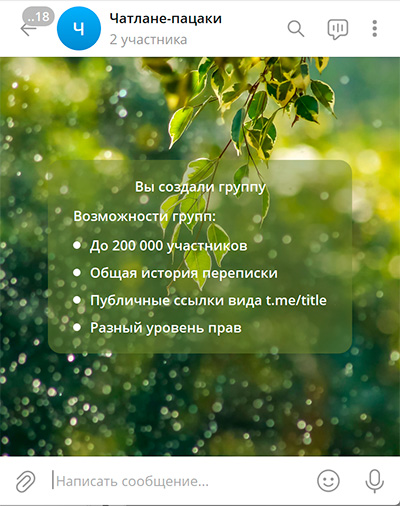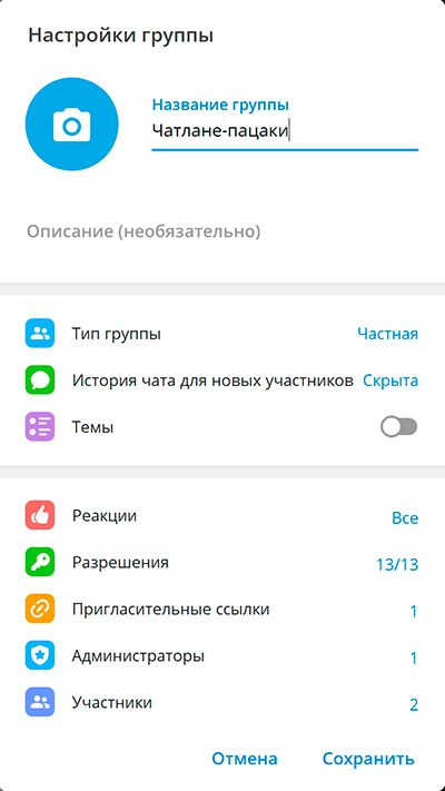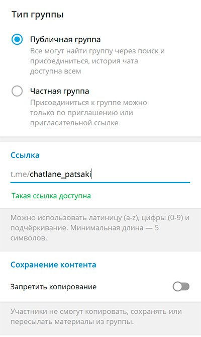 Там же можно задать ссылку на этот чат, чтобы потом ею делиться.