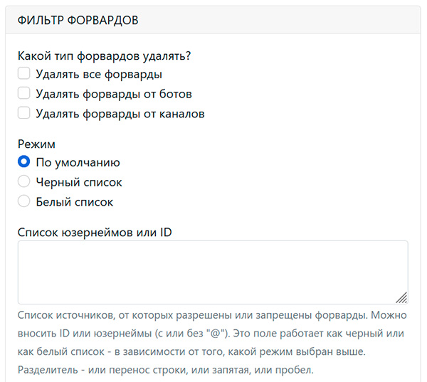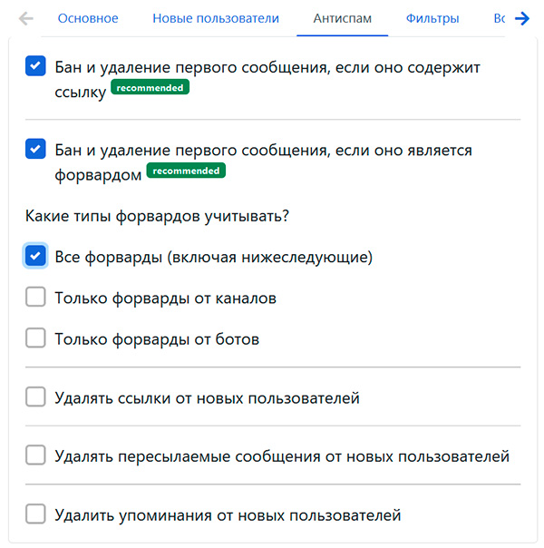Ну и также есть еще фильтр форвардов и отдельный раздел "антифлуд", который используется только при атаке ботов.