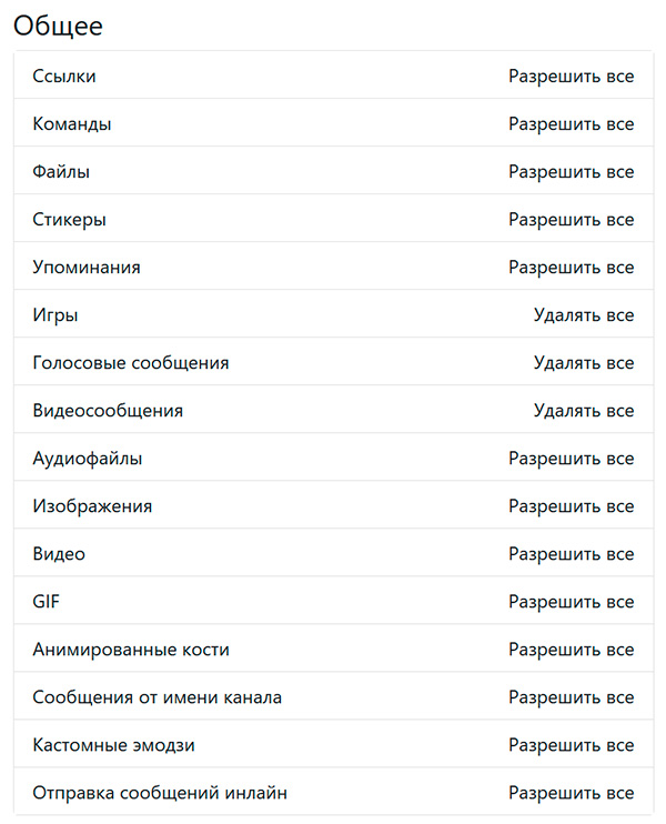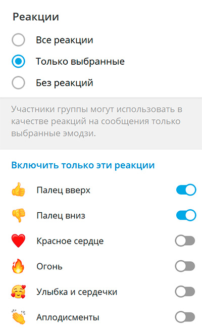 "Реакции" - вы можете разрешать любые реакции на сообщения других пользователей, только выбранные вами реакции или вообще запретить какие-либо реакции.
