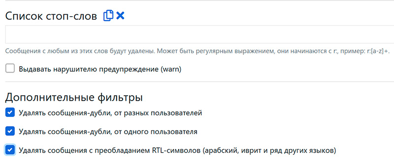И все, после этого вы получаете очень продвинутую систему защиты чата от спама и его модерирования. Задача выполнена!