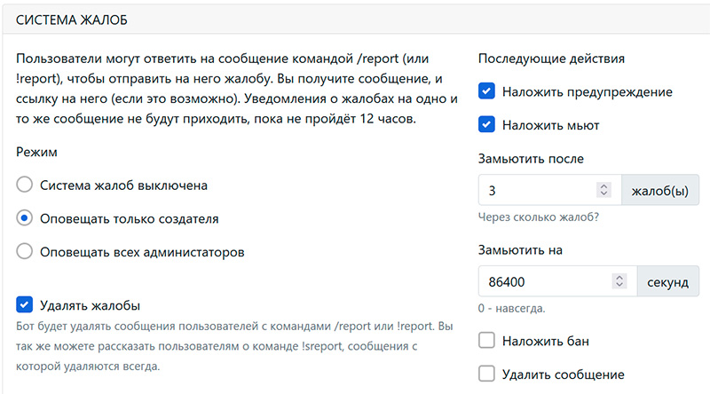Следующий важный пункт верхнего меню настроек модерации - "Жалобы". Он очень важен для быстрого реагирования и эффективного модерирования. Потому что это позволит участникам вашего чата отправлять репорты (жалобы) на спамеров и неадекватов.