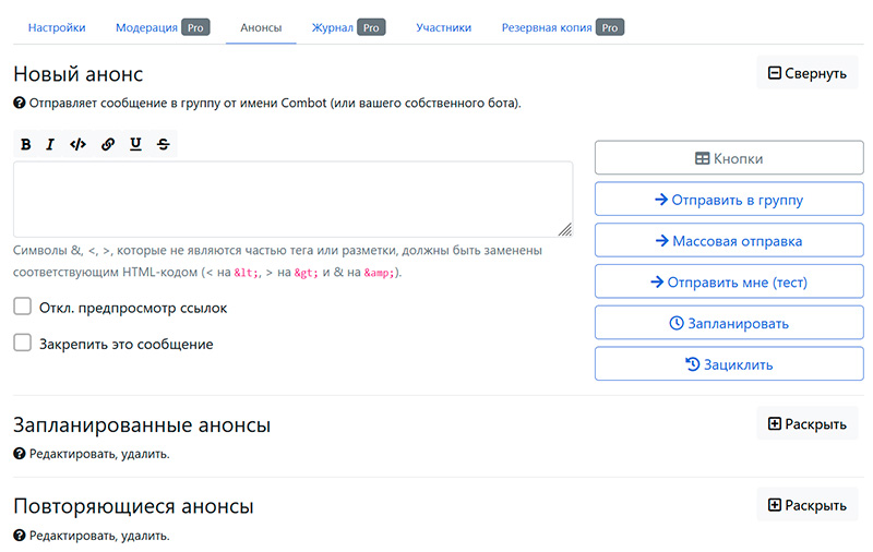 Раздел, в котором можно готовить различные анонсы для чата (может быть полезным), публиковать их, планировать публикацию, планировать повторяющиеся анонсы.