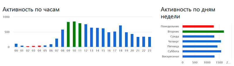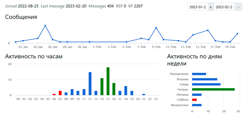Ну и есть еще раздел с аналитикой: количество сообщений по дням, активные пользователи, активность по часам и дням недели, статистика по пользователям и их "социальному капиталу" в чате (если он включен).