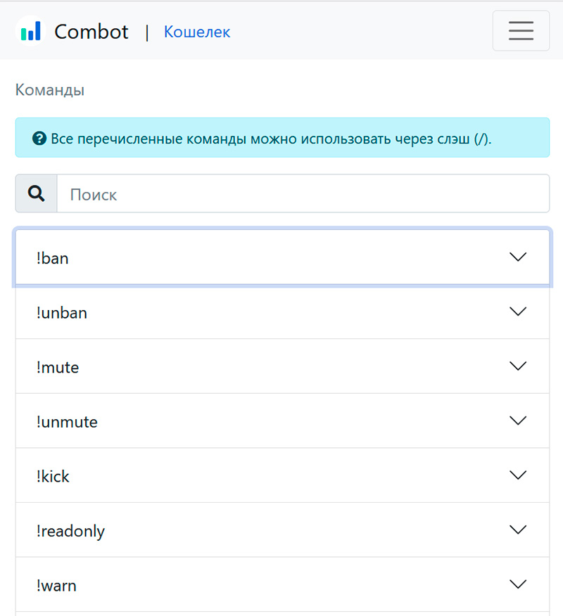 Список команд Combot, которые вы можете использовать в чате, доступны в вашем личном кабинете в Combot - вот этот список. Команды вводятся или с восклицательным знаком, или через слэш.