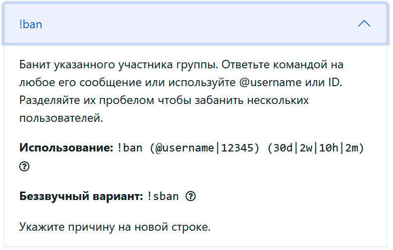 При нажатии на каждую команду - подробно объясняется, как она работает. Вот, например, как работает бан и его опции.