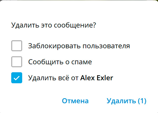 Если же речь идет о неадеквате, который порядком "наследил" в чате, и вы не хотите там оставлять продукты его жизнебездеятельности, то тогда нужно нажать на ссылку перехода на сообщение, там в ответе на сообщение забанить пользователя командой !ban, затем правую кнопку мыши на сообщении, выбрать "Удалить", и там "Удалить всё" (в скобках покажут общее количество сообщений от данного пользователя).