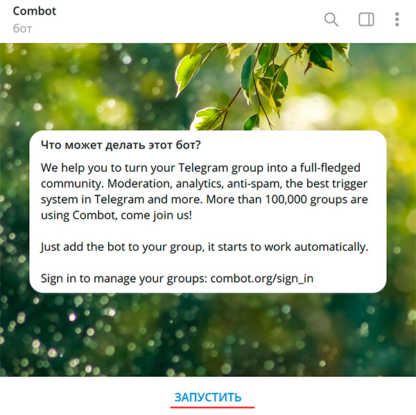 - запускаем Combot в вашем личном Телеграме;