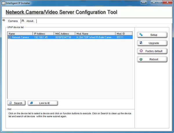 Программа конфигурации показывает подключенные камеры, позволяет перепрошивать их, восстанавливать заводские настройки и подключаться к админке камеры через браузер. (Интерфейс тут на английском,но можно с сайта разработчика взятьсоответствующий языковый пакет - в томчисле русский.)