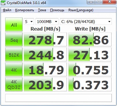 Скорость работы жесткого диска по CrystalDiskMark.