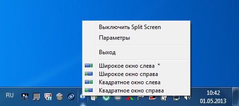 Split Screen - утилита, делящая экран между двумя задачами по заданной схеме. Я так и не понял, зачем она вообще нужна, когда все то же самое можно сделать средствами системы - ну разве что соотношение окон придется менять мышкой.