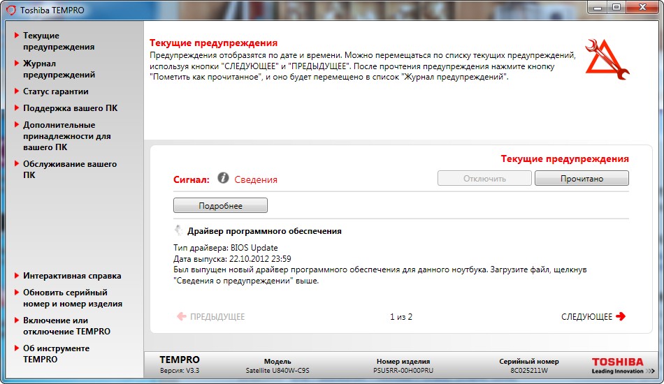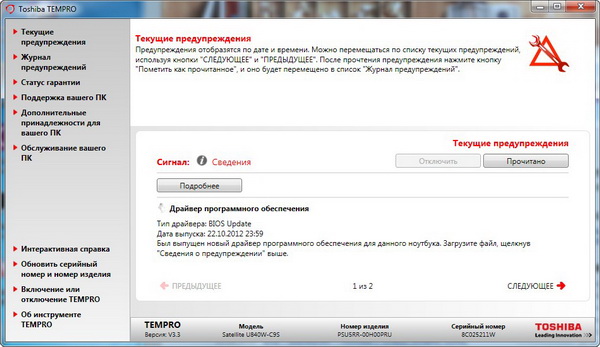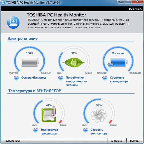 Системная утилита Toshiba TEMPRO. Отслеживает состояние системы и дает всякие советы по поводу того, как оптимизировать работу устройства.