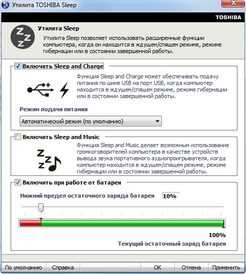 Toshiba Sleep - настройки параметров зарядки, а также включение режима, при котором ультрабук может проигрывать музыку, находясь в спящем режиме.