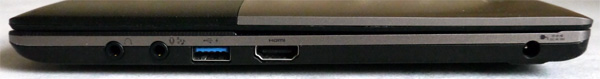 Правый торец: выход наушников, гнездо микрофона, USB 3.0, HDMI, вход адаптера питания.