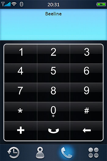Телефон запускается большой кнопкой внизу десктопа. Кнопка на самом деле не сильно выделяется - сначала кажется, что это информационная строка, поэтому не понятно, как вообще вызвать номеронабиратель.