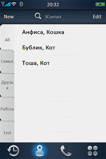 Контакт-лист сделан очень грамотно: абоненты делятся на группы, которые реализованы в виде крайне удобных закладок (в iPhone бы такие!), также есть группа All, где представлены все абоненты.