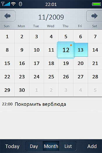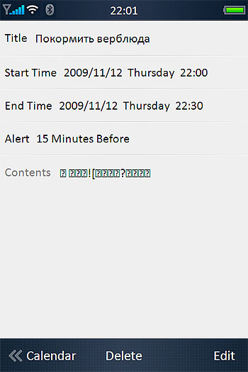 Календарь - самый обычный. Синхронизируется с Outlook довольно четко, однако в комментах шрифт идет кривой, хотя все остальное выводится нормально.