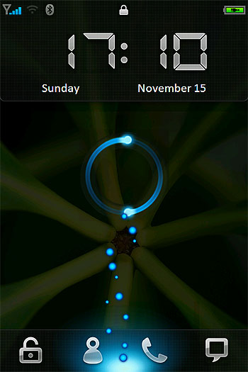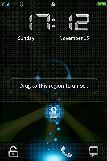 Чтобы разблокировать телефон, нужно перенести в нужный прямоугольник какую-то из пиктограмм: просто разблокировать, вызвать контакты, телефон или SMS-сообщения.