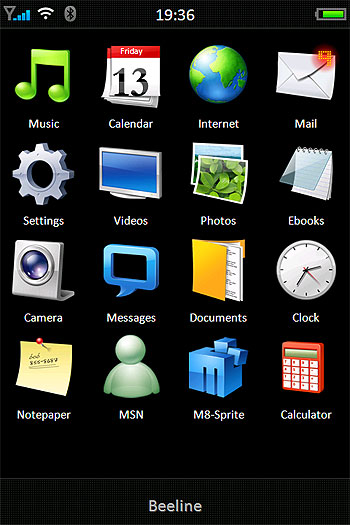 Стиль, как легко видеть, - чистый iPhone: окно десктопа с иконками приложений. Разве что нижняя панель отсутствует, но вместо нее - вызов телефона и что-то вроде области уведомлений.