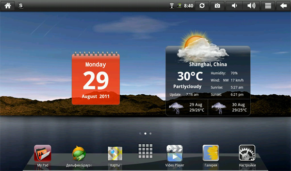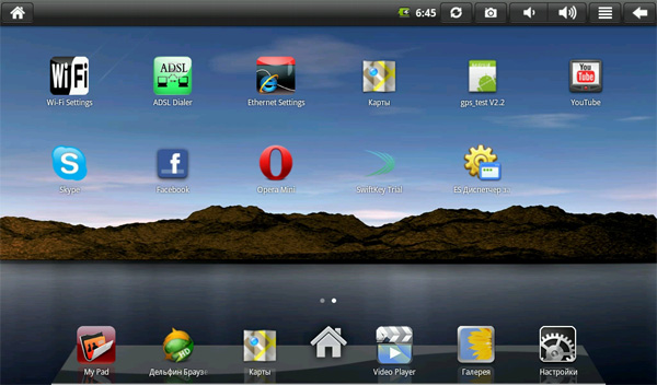 Десктоп здесь определенным образом переработан: сделана нижняя док-панель, в верхнюю область уведомлений вынесены экранные кнопки, дублирующие физические (возврат, меню, громкость, домой), также добавлена кнопка снятия скриншота экрана (она, разумеется, недоступна в полноэкранных приложениях, где нет области уведомлений).