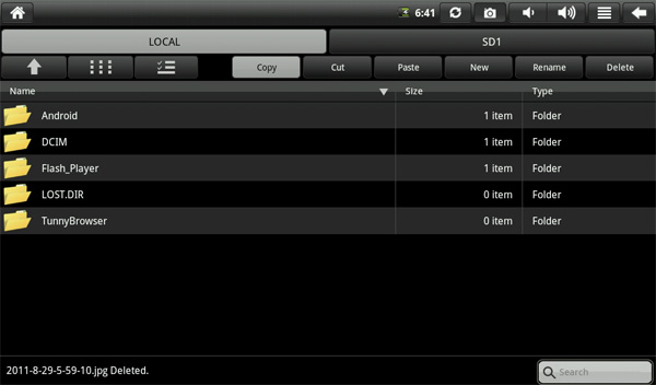 Если в устройство вставляется SD-карта или подключается USB-флешка, то их содержимое появляется в виде еще одной закладки (на скриншоте справа - закладка SD-карты). Правда, USB-флешка у меня сразу работать не стала - просто не определилась. Но оказалось, что ее надо было отформатировать в FAT32 или FAT, так как NTFS планшет не понимает.