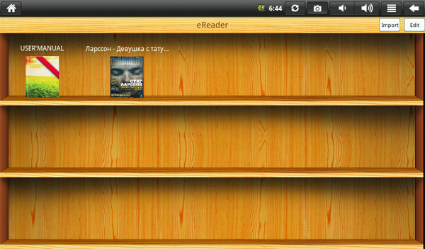 В спецификации к планшету и к программе не написано, какие форматы она поддерживает. Из моего стандартного набора она увидела только EPUB. Правда, читать было удобно,  если не считать того, что вертеть страницы на резистивнике лучше всего стилом - пальцем срабатывает далеко не с первого раза.