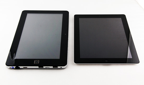 Внешний вид - традиционный почти для всех китайских закосов под айпад: черная окантовка, одна-единственная кнопка, как в айпаде, верхняя панель покрыта не стеклом, а пластиком крайне сомнительного качества, на поверхности которого при малейшем изменении угла поворота планшета виднеются какие-то амурские волны.