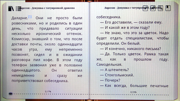 Тут есть встроенный ридер eReader, почти один в один честно спертый с эпловской iBooks. Но это и хорошо, я на данный момент считаю iBooks одной из самых удобных программ для чтения.