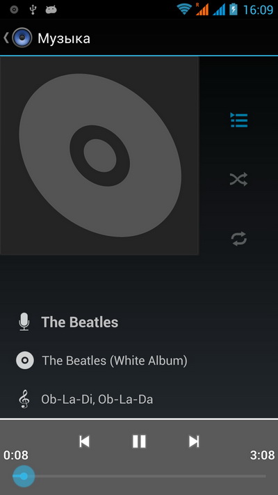 Музыка. Стандартное андроидное убогое приложение. Кстати, звук у динамика довольно громкий, но качество - очень так себе: на полной громкости динамик подхрипывает.