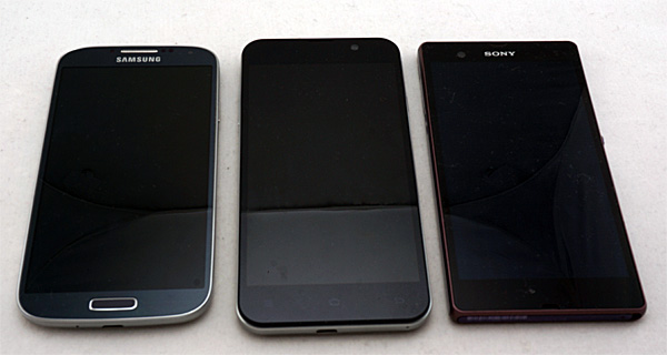 Качество сборки у смартфона - приличное, но не более того. Вот он рядом с флагманскими телефонами от Samsung и Sony.
