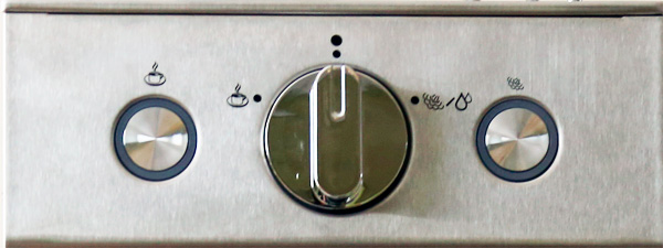 Управляется машина очень просто. На передней панели есть переключатель режимов: выключено, кофе, подача пара (взбивать молоко). И две кнопки: приготовить кофе, взбить молоко. Вокруг кнопок световые индикаторы, показывающие уровень нагрева для данного режима: медленно мигающий индикатор - машина нагревается, постоянно горящий - нужная температура, быстро мигающий - перегрев, требуется время на охлаждение (такое бывает, если переключить с подачи пара на изготовление кофе).