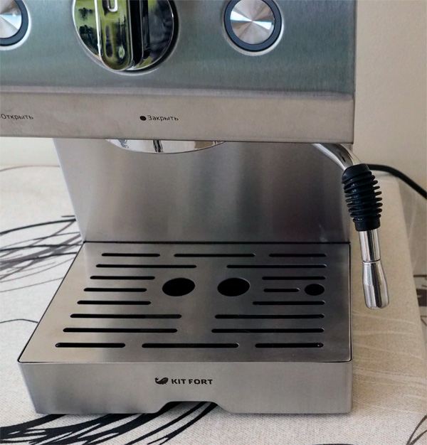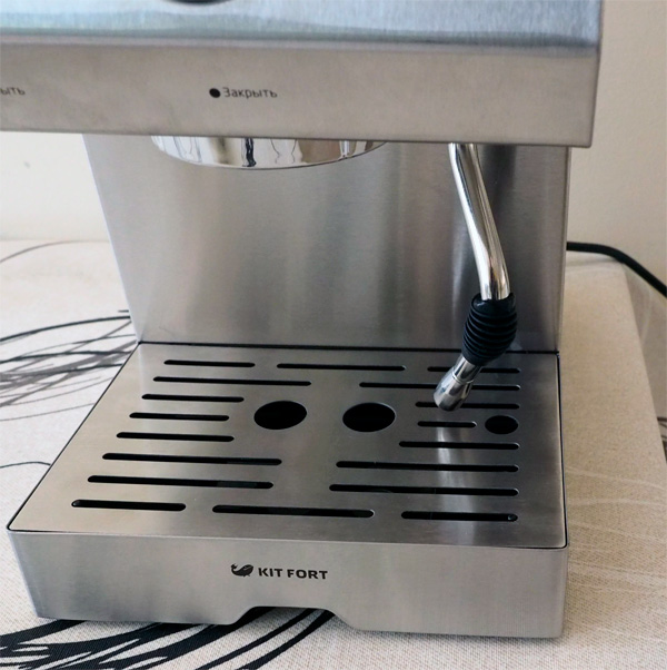 Когда патрубок не нужен, он снова задвигается под верхнюю часть кофеварки, чтобы не мешал.