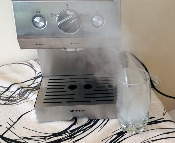 После этого выдвигаем стимер, включаем его на несколько секунд, чтобы слилась вода и пошел пар, после чего выключаем, подставляем под стимер стакан с порцией молока (максимум - половина объема стакана), опускаем в молоко стимер и снова включаем. (Включать его нужно только после опускания в молоко, а не перед этим.)