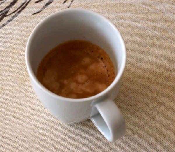 Ну и все, чашка эспрессо (в моем случае) готова. Кофе, как полагается, имеет плотную пенку, на вкус совершенно ничем не отличается от кофе, полученного в моей навороченной кофемашине. И я не почувствовал никакого отличия от эспрессо, приготовленного в профессиональных итальянских кофемашинах, которое подается в кафе. (Наоборот, там нередко попадается кофе, что называется, не фонтан, но понятно, что это зависит от используемых кофейных зерен.)
