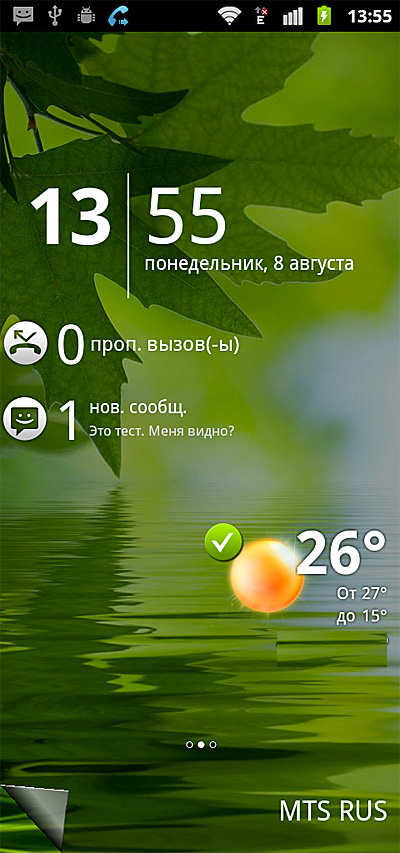Экран блокировки тут очень даже информативный. Он состоит из трех страниц: музыка, информация (звонки, SMS, время, погода), календарь.
