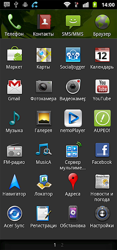 Здесь установлена операционная система Android 2.3.3 с фирменным интерфейсом Acer UI.