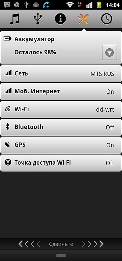 Область уведомлений, расположенная сверху, обзавелась вкладками, при нажатии на которые открываются соответствующие подразделы. Причем в некоторых вкладках можно делать различные настройки - например, включать-выключать беспроводные сети.