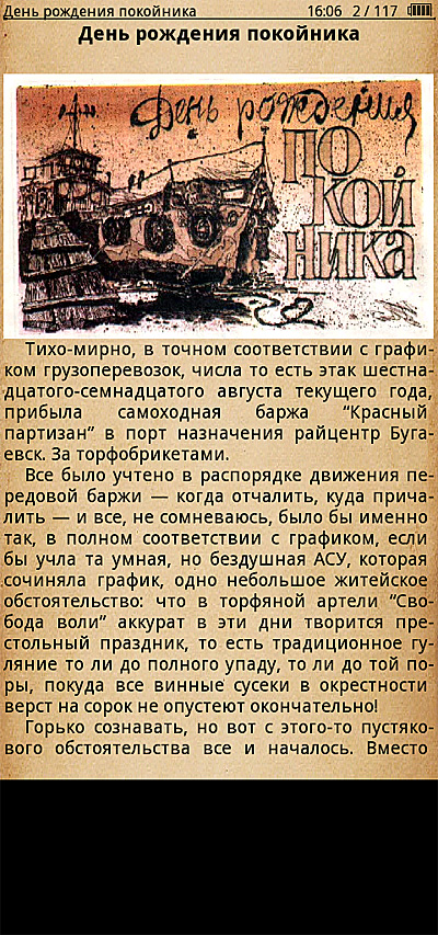 Тут установлена пара каких-то приложений для скачивания-покупки книг с западных сайтов, но они как ридеры совсем неудобны, да и форматов нужных не знают. Но тут не проблема - есть хороший бесплатный Cool Reader, который я и установил. Он понимает папки, FB2, EPUB и так далее, хорошо настраивается. Однако у Cool Reader слегка снесло крышу от подобного разрешения экрана - определенную часть экрана он решил не использовать.