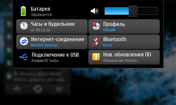 Это рабочий стол Maemo. Точнее, один из рабочих столов - их всего четыре, они закольцованы и меняются жестом по экрану слева направо или справа налево.