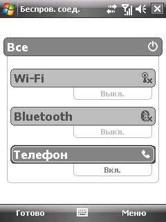 Менеджер беспроводных соединений - стандартный винмобайловый, то есть кривоватый и неудобный (там почему-то отсутствует отдельная кнопка отключения передачи данных, поэтому отрубить EV-DO можно только вместе с выключением телефона). И вызывается он почему-то только из значка верхней справочной панели экрана, отдельной пиктограммы нет.