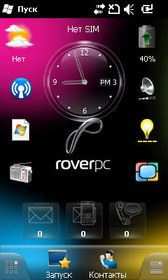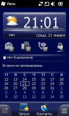У SPB Mobile Shell есть несколько базовых функциональных окон, а также десктоп "Свободный вид", который с помощью виджетов можно настраивать как угодно. В базовом основном окне (см. скриншот чуть выше) - полезная справочная информация (погода, профили, коммуникации, громкость, батарея, яркость экрана), часы и три информера - e-mail, SMS, телефон, - на которых высвечиваются полученные сообщения и пропущенные звонки. Внизу две большие пиктограммы - окно запуска программ и вызов контактов.