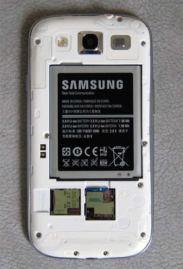Задняя крышка - на защелках, снимается целиком без серьезных усилий. Карта памяти вставляется без вынимания аккумулятора, а вот микросимка - только при вытащенном аккумуляторе.