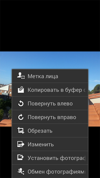 При просмотре фотографии доступны некоторые виды редактирования, система умеет отмечать лица и затем распознавать их (кстати, делает это очень неплохо, особенно если самому сначала отметить человека в фас, две трети и профиль), обменивается фотографиями с другими устройствами (например, может отправить вашему другу его фотографию), выдает данные EXIF и даже показывает место съемки на карте, если включен геотэггинг.