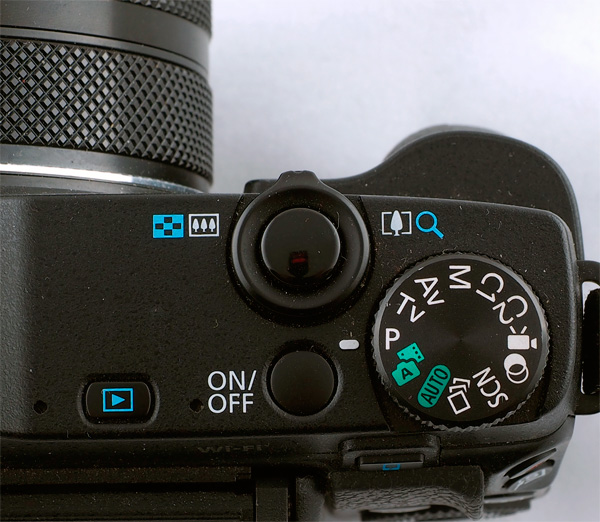 На верхнем торце - традиционное зубчатое колесо режимов, утопленная кнопка включения, которую не сразу можно нащупать при необходимости, качелька зума под кнопкой съемки и кнопка просмотра отснятого.