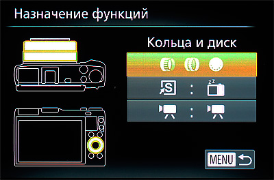 Ну и единственное в настройках, что хоть как-то похоже на более или менее продвинутую камеру, - это назначение нужных функций всем трем кольцам/колесам (два на объективе), настраиваемой клавише S и кнопке съемки видео. Кольца и колесо, кстати, могут отдельно настраиваться для каждого режима съемки.