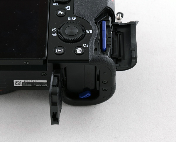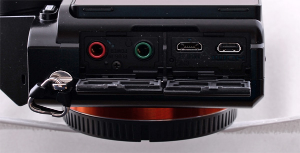 Отсек под карту памяти, слава богу, расположен отдельно - как на зеркалках. А то инженеры Sony любят лепить слот карты рядом с аккумулятором и обычно долго думают над тем, как бы этот слот так расположить, чтобы из-за крышки карту было бы невозможно вытащить руками. Подобную схему они реализовали в модели NEX-6, и я боялся, что это станет новой традицией, однако, слава богу, тут отдельный слот - ура, ура.