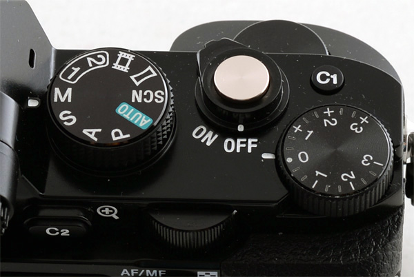 Также на верхней части корпуса находятся зубчатое колесо режимов, кнопка "С1" (у RX1 была одна настраиваемая клавиша, здесь их три), зубчатое колесо компенсации экспозиции и зубчатое колесо на выступе.